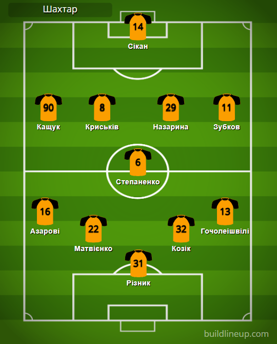 «Шахтер»: Ризнык – Азарови, Матвиенко, Козик (Ракицкий, 65), Гочолеишвили – Степаненко (Кастилло, 74) – Кащук (Конопля, 64), Крыськив, Назарина, Зубков (Вьюнник, 65) – Сикан (Судаков, 65).