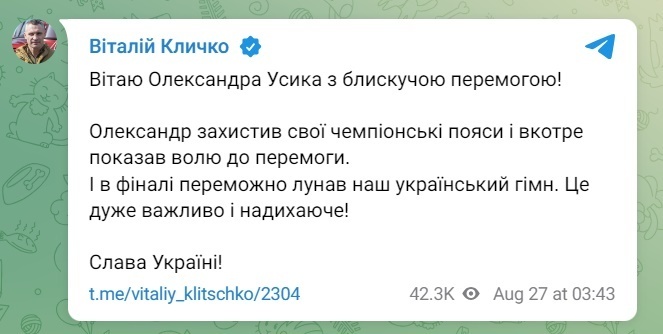 Бывший чемпион мира по боксу, а ныне – мэр Киева, Виталий Кличко поздравил украинца Александра Усика с победой над британцем Даниэлем Дюбуа.