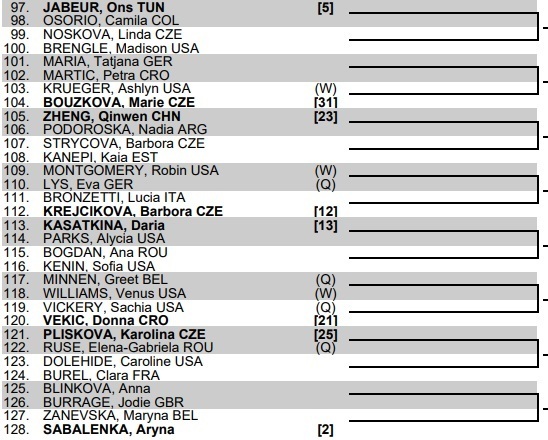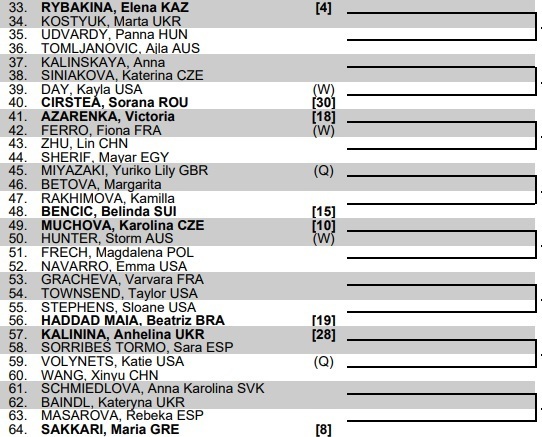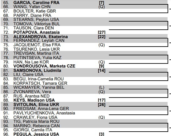 Чуть ниже расположились Джессика Пегула, Каролин Гарсия, Маркета Вондроушова, Людмила Самсонова, Мэдисон Киз, Екатерина Александрова и Анастасия Потапова. Не лучшая часть сетки для Элины Свитолиной, которая и так с травмой. Также здесь находится Леся Цуренко.