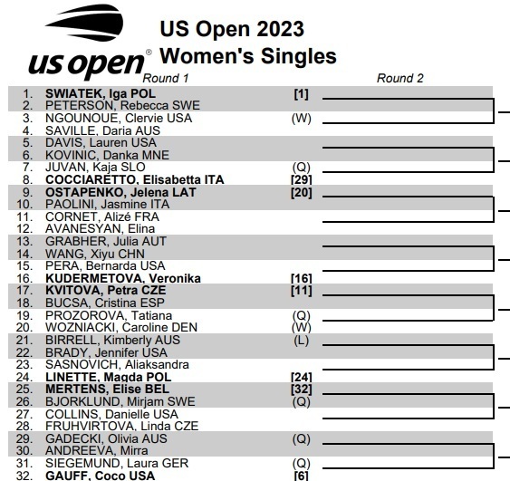 Что касается результатов жеребьевки, то они сбалансированные. В первую четверть сетки к Свёнтек и Гофф попали Петра Квитова, Вероника Кудерметова, Даниэль Коллинс, Дженнифер Брэди, Ализе Корне и Элиза Мертенс. В первом круге ожидается интересный матч между Аленой Остапенко и Жасмин Паолини. Также здесь сыграет экс-первая ракетка мира Каролин Возняцки, во втором раунде возможен ее матч с Квитовой.