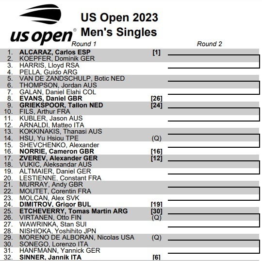 В первой четверти сетки с Алькарасом будут играть Янник Синнер, Александр Зверев, Кэмерон Норри, Григор Димитров и участники финала в Вашингтоне Таллон Грикспор и Дэн Эванс. Также здесь есть ветераны Энди Маррей и Стэн Вавринка.