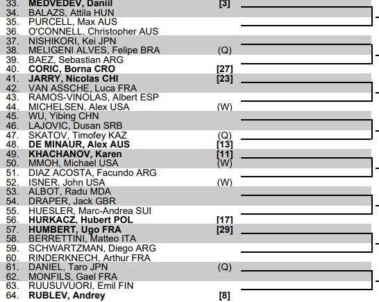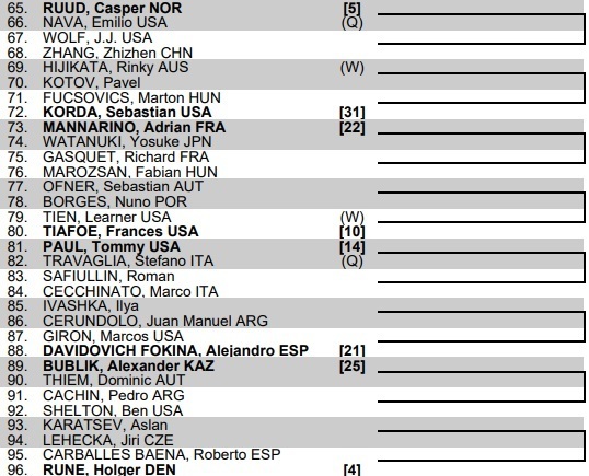 Чуть ниже традиционно расположились Каспер Рууд и Хольгер Руне. С ними за путевку в полуфинал будут вести борьбу Фрэнсис Тиафо, Томми Пол, Себастьян Корда и Александр Бублик. Также здесь присутствуют несколько теннисистов, которые могут удивить, это Аслан Карацев, Доминик Тим, Джей-Джей Вульф и Адриан Маннарино.