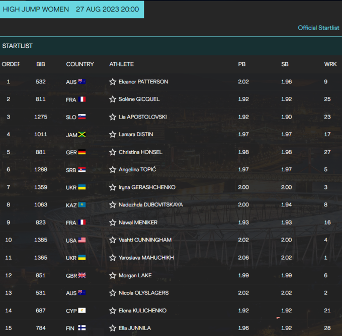 ЧМ-2023. Прыжки в высоту. Женщины. Финал. Стартовый лист