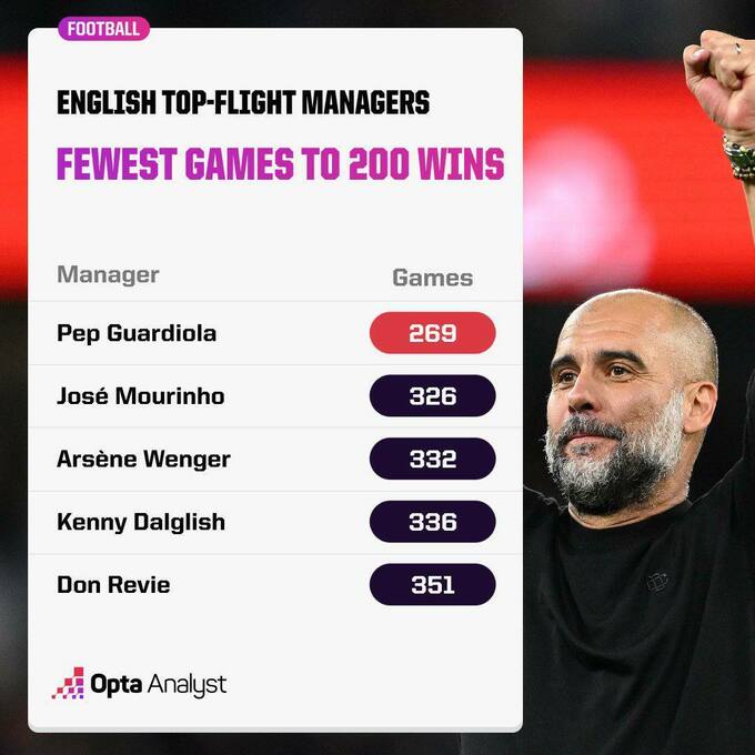 Для того, чтобы одержать 200 побед, Гвардиоле понадобилось 269 матчей, что является рекордом не только АПЛ (с 1992 года), но и в целом элитных дивизионов чемпионата Англии.