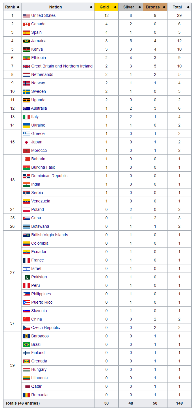 Лучшими в медальной таблице стали США (12–8–9), Канада (4–2–0) и Испания (4–1–0).