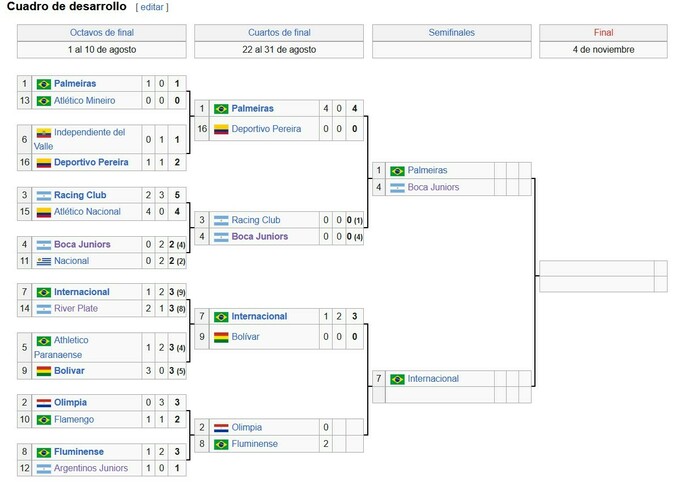 Соперник «Боки Хуниорс» в полуфинале определялся в матче между бразильским «Палмейрасом» и колумбийским «Депортиво Перейра». Гости за 15 минут до истечения основного времени остались в меньшинстве — две желтые карточки за три минуты получил Хуан Себастьян Кинтеро. Однако воспользоваться большинством «Палмейрас» не смог — матч завершился со счетом 0:0 и выигравший первую встречу бразильский клуб вышел в полуфинал.
