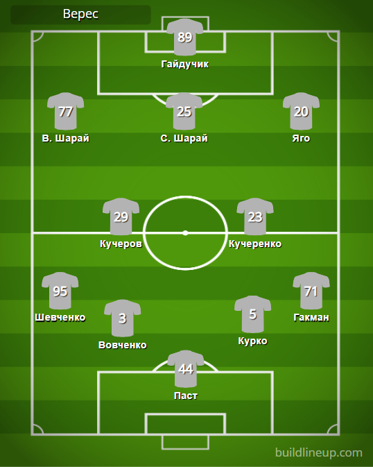 «Верес»: Паст – Шевченко, Вовченко, Курко, Гакман – Кучеров, Кучеренко – В. Шарай (Свитюха, 90+1), С. Шарай (Близниченко, 73), Яго (Шестаков, 62) – Гайдучик (Марусич, 73).