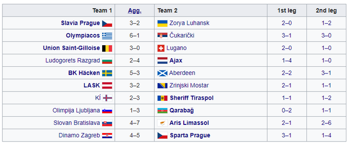 - Спарта Прага (Чехия) – Динамо Загреб (Хорватия) – 4:1 (первый матч – 1:3)