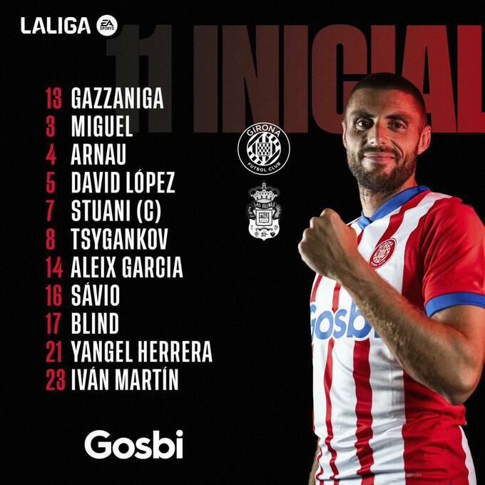 Состав «Жироны»: Гассанига, Мигель, Арнау, Давид Лопес, Блинд, Алеш Гарсия, Янгель Эррера, Иван Мартин, Цыганков, Савио, Стуани