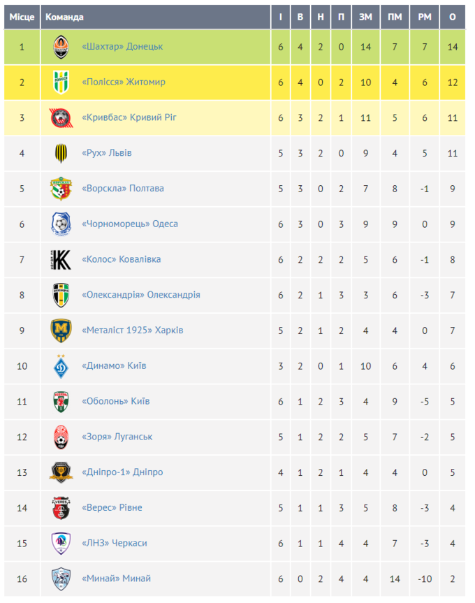 Внизу турнирной таблицы чемпионата Украины после 6-го тура находятся «Верес», ЛНЗ (по 4 балла) и «Минай» (2 пункта).