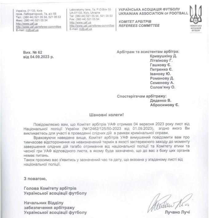 Комитет арбитров УАФ отреагировал на обращение из полиции оперативно и официально уведомил всех упомянутых сотрудников об отстранении от исполнения обязанностей на время проведения следственных действий.