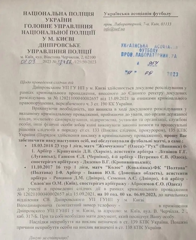 Днепровское управление полиции города Киева для проведения следственных действий вызвало несколько украинских футбольных арбитров и ассистентов, а также двух наблюдателей арбитража.