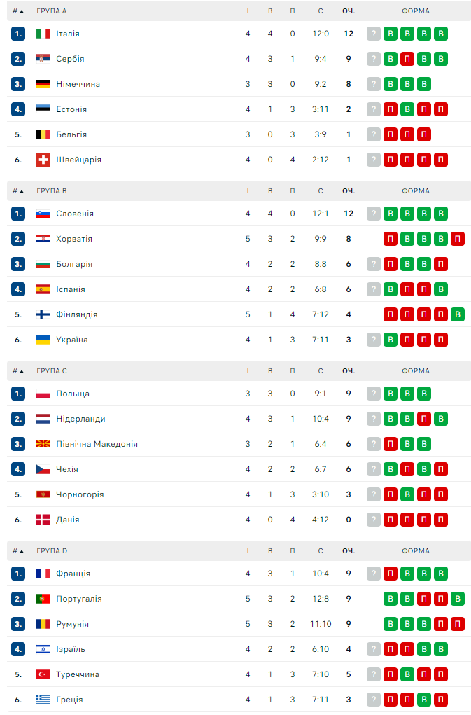 Сборная Испании победила Болгарию (3:1), потом потерпела два сухих поражения от Хорватии и Словении, а затем обыграла Финляндию (3:1).