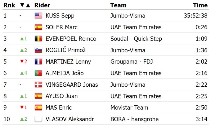 Красную майку лидера общего зачета сохранил другой гонщик «Jumbo Visma», американец Сепп Кусс, который сегодня показал 13-й результат.