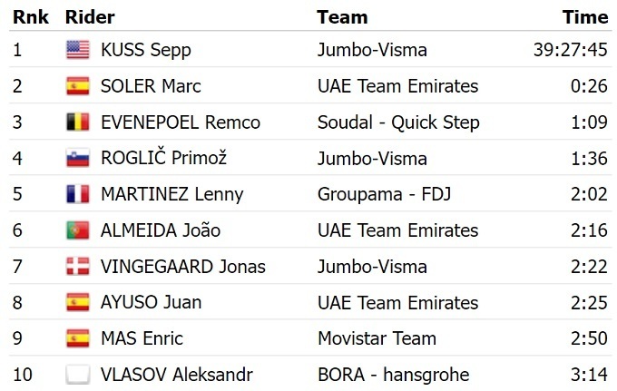 В общем зачете Вуэльты серьезных изменений не произошло. Красную майку лидера сохранил американец Сепп Кусс из «Jumbo Visma».