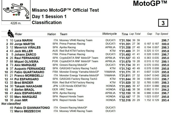По итогам первой сессии лучшее время показал Лука Марини из VR46. Итальянец на мотоцикле Дукати проехал 39 кругов, на последнем из которых показал лучшее время – 1'31.164. Вторым стал Хорхе Мартин из Pramac также на Дукати, а замкнул первую тройку Маверик Виньялес из заводской команды Априлия.