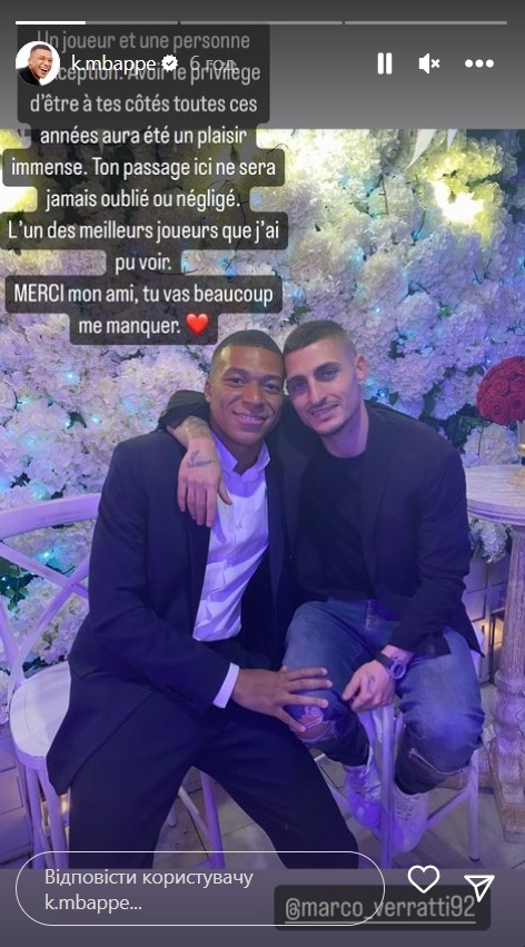 «Исключительный игрок и человек. Имел честь быть рядом с тобой все эти годы. Это было огромным удовольствием. Твое время здесь никогда не забудут и не пренебрегают им. Один из лучших игроков, которых я видел. Спасибо, мой друг, я буду очень скучать по тебе», — написал Мбаппе в адрес Верратти.