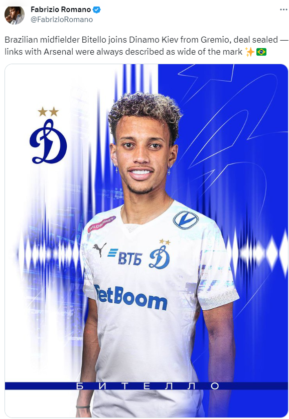 Интересно, что известный инсайдер Фабрицио Романо, анонсируя трансфер, перепутал разные клубы и отправил Бителло в «Динамо» Киев.