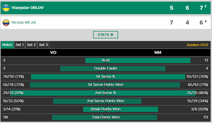 - 14:00. Владислав Орлов – Николас Мехия – 5:7, 6:4, 7:6 (7:4)