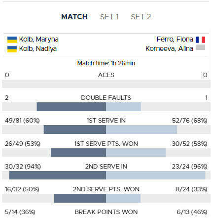 Марина Колб (Украина) / Надежда Колб (Украина) – Фиона Ферро (Франция) / Алина Корнеева – 6:7 (7:9), 5:7