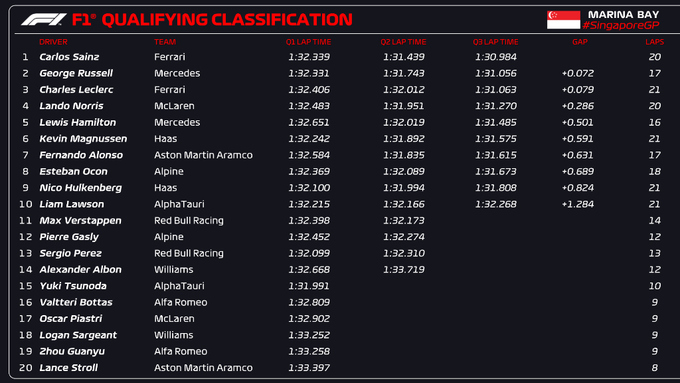 Состоялась квалификация в рамках Гран-при Сингапура. Обладателем поула стал пилот Феррари Карлос Сайнс, который выиграл вторую квалификацию подряд.