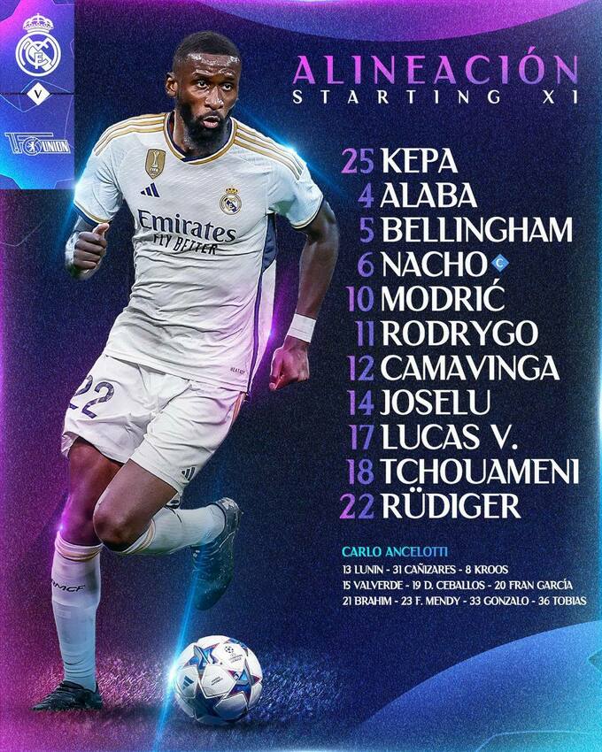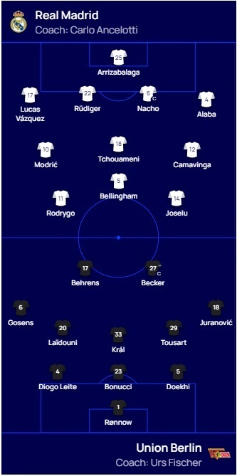 «Реал»: Кепа Аррисабалага, Алаба, Начо, Рюдигер, Лукас Васкес, Тчуамени, Камавинга, Модрич, Беллингем, Хоселу, Родриго