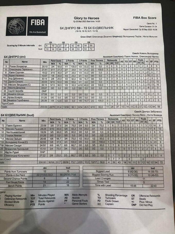 Будивельник: Сандул 15+8 подборов – 4 потери, Луценко 13, Зайцев 10, Конев 9+15 подборов + 2 перехвата + 2 блок-шота, Буренко 9 + 7 подборов + 2 передачи + 2 перехвата, Кольченко 4 – старт, Кошеватский 6 + 5 передач, Лукинский 6 + 3 подбора, Хижняк 0.