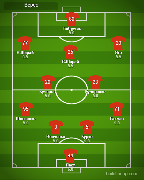 «Верес»: Паст, Вовченко, Курко, Шевченко, Гакман, Кучеренко (Балан, 78), Яго (Шестаков, 66), С. Шарай (Марусич, 46), Кучеров, В. Шарай (Свитюха, 90), Гайдучик (Кухарук, 78).