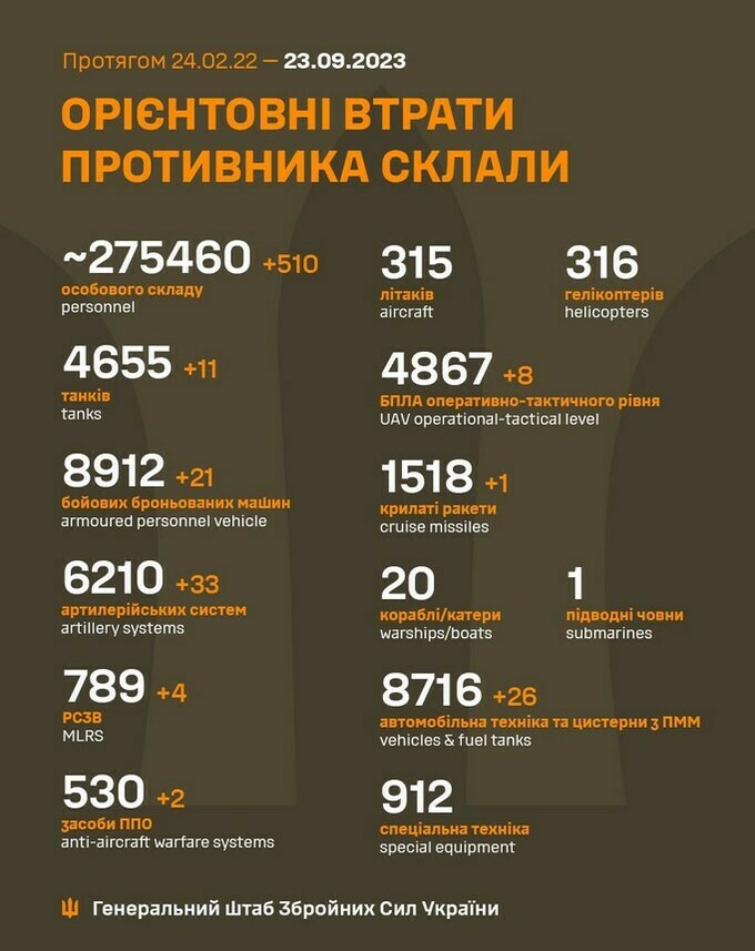 Предлагаем вашему вниманию сведение общих боевых потерь россии с 24.02.2022 по 23.09.2023.