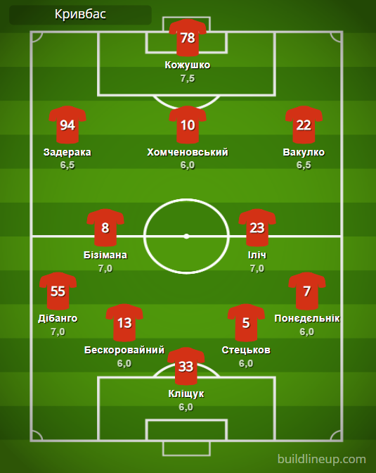 «Кривбасс»: Клищук – Дибанго, Бескоровайный, Стецьков, Понедельник – Бизимана, Илич (Татарков, 72) – Задерака (По, 76), Хомченовский, Вакулко (Приходько, 71) – Кожушко (Дебелко, 62).