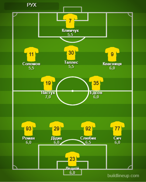 «Рух»: Ледвий - Сыч, Дидык, Слюбик, Роман - Эдсон (Плюман, 52), Пастух - Квасница (Рунич, 76), Таллес (Федор, 65), Соломон (Теслюк, 65) - Климчук.