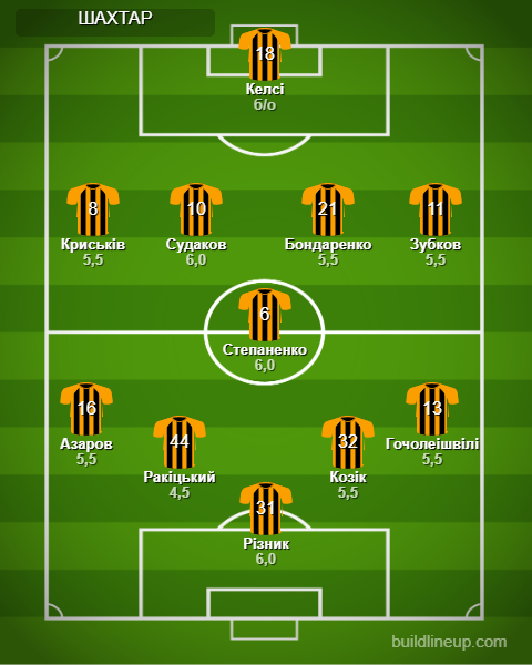 «Шахтер»: Ризнык - Гочолеишвили, Козик, Ракицкий, Азаров - Степаненко, Судаков (Конопля, 71) - Зубков (Сикан, 81), Бондаренко (Назарина, 71), Крыськив (Кастилло, 61) - Келси (Мироші, 25).