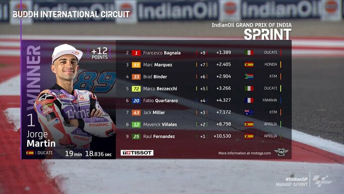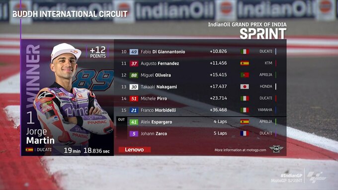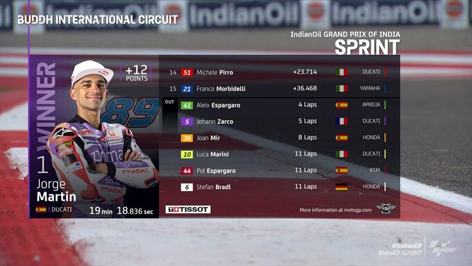 На первом в истории MotoGP Гран-при Индии завершился спринт, который выиграл лидер команды Pramac Хорхе Мартин. Таким образом испанец отыграл еще три очка отставания от лидера чемпионата мира Франческо Баньяйи, который финишировал вторым. Замкнул первую тройку восьмикратный чемпион мира Марк Маркес. Для лидера Хонды этот подиум стал вторым в нынешнем сезоне.