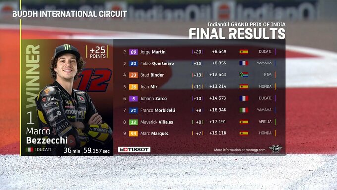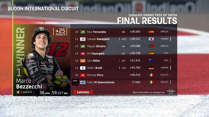 Лидер команды VR46 Марко Бедзекки выиграл основную гонку первого в истории MotoGP Гран-при Индии, стартовав с поула. Молодой итальянец выиграл старт, однако в середине дистанции его ненадолго обошел Франческо Баньяйя. Но действующий чемпион мира упал за восемь кругов до финиша и сошел с дистанции.