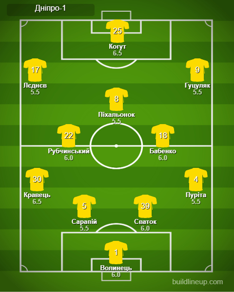 «Днепр-1»: Волынец, Кравец, Сарапий, Сваток, Пурита (Гаджиев, 79), Рубчинский (Мирошниченко, 79), Когут (Е. Пасич, 58), Пихаленок (Витиньо, 67), Бабенко, Леднев, Гуцуляк.