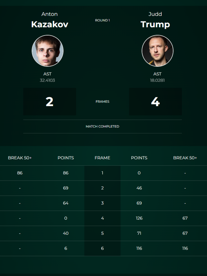 Антон Казаков (Украина) – Джадд Трамп (Англия) – 2:4