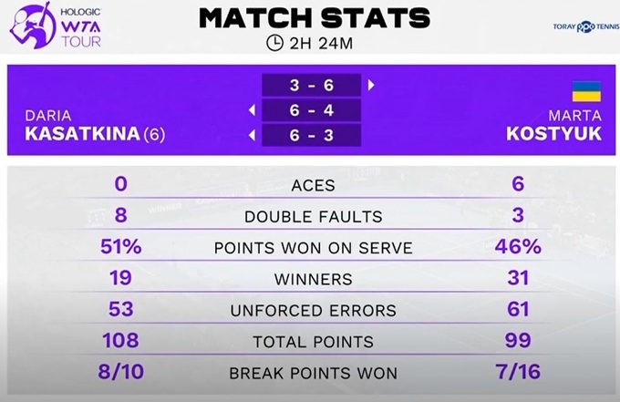 Костюк сыграла 11-й матч против соперницы из топ-15 мирового рейтинга и в восьмой раз проиграла. В последних шести матчах счет 3-3.