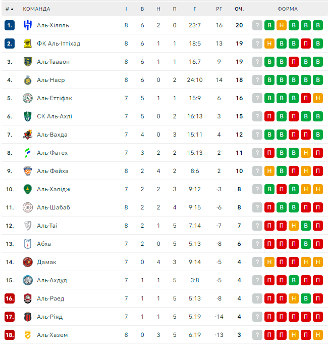 «Аль-Хиляль» лидирует в чемпионате, набрав 20 очков после 8 матчей.