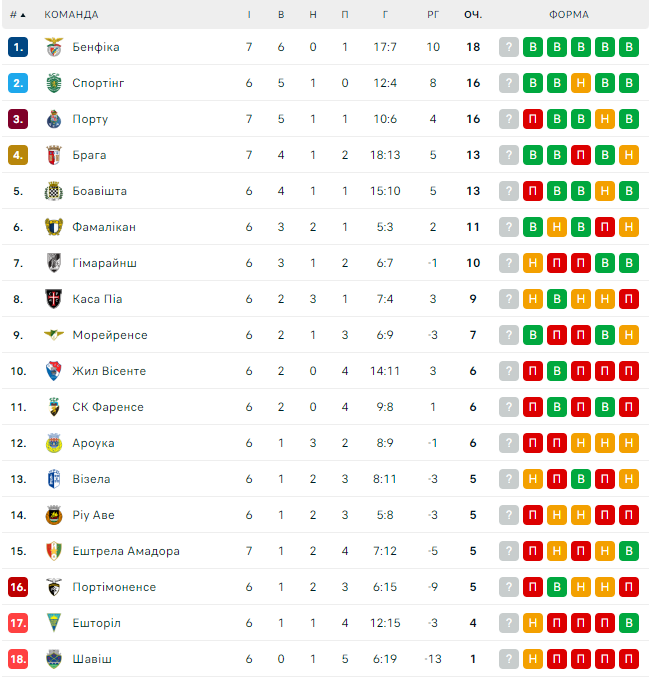 «Бенфика» вышла в лидеры в турнирной таблице, набрав 18 очков после 7 матчей. «Спортинг» и «Порту» имеют по 16 пунктов.