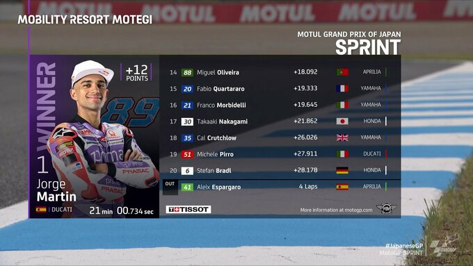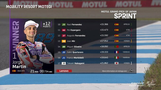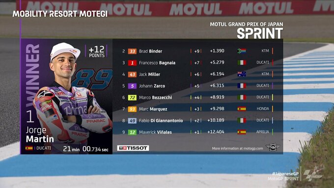 Лидер команды Pramac Хорхе Мартин одержал победу в спринтерской гонке на гран-при Японии, опередив ставшего вторым лидера заводской команды КТМ Брэда Биндера на 1.390 секунды. Замкнул первую тройку действующий чемпион мира Франческо Баньяйя из заводской команды Дукати.