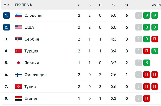 В группе В (матчи проходят в японской столице Токио) 6 сборных уже успели провели по две встречи. Без потерь их провели хорошо нам знакомая команда Словении, а также сборная США. При этом обе сборные не проиграли еще ни одной партии. Команда Турции в первом туре нанесла поражение Сербии 3:1, после чего проиграла словенцам. А сербы во втором туре одолели Тунис 3:0. С победы начала турнир и Япония, правда, хозяева площадки с трудом одолели финскую команду 3:2.