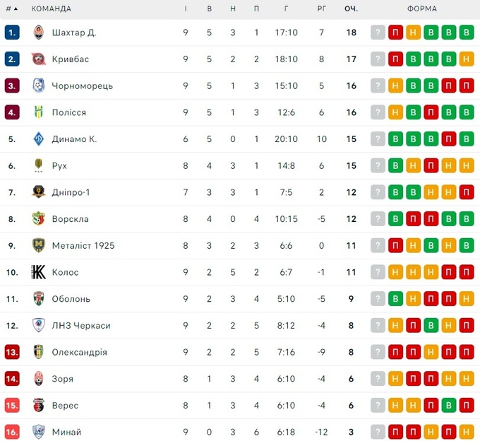 По 16 очков имеют «Черноморец» и «Полесье». За ними располагается «Динамо», у которого 15 баллов после 6 матчей. Именно столичная команда на данный момент является скрытым лидером УПЛ, так как имеет среди всех клубов наименьшие очковые потери.