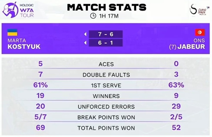 Марта Костюк (Украина) – Онс Жабер (Тунис) – 7:6(5), 6:1