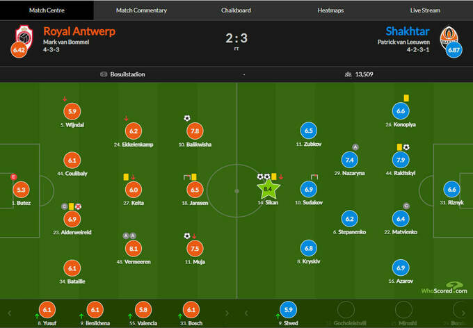 Оценки WhoScored за матч Антверпен – Шахтер – 2:3