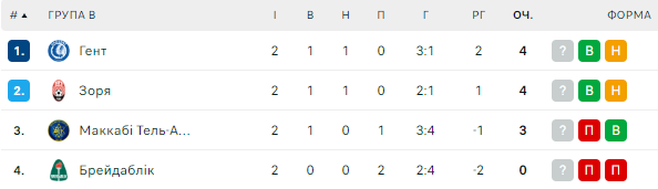 Турнирная таблица. Гент и Заря лидируют в группе ЛК, набрав по 4 очка