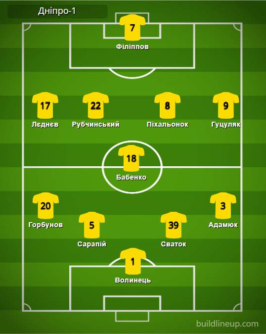 «Днепр-1»: Волынец – Горбунов (Каплиенко, 60), Сарапий, Сваток, Адамюк – Бабенко – Леднев (Е. Пасич, 61), Рубчинский, Пихаленок, Гуцуляк (Мирошниченко, 79) – Филиппов (Танчик, 61).