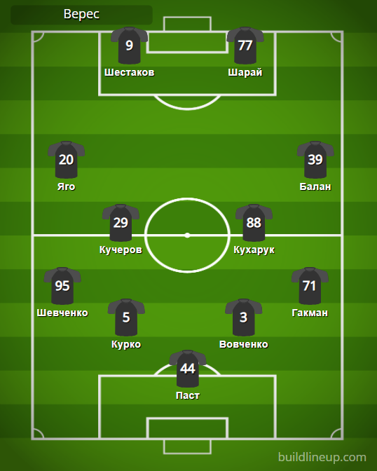 «Верес»: Паст – Шевченко, Курко, Вовченко, Гакман – Кучеров (Кучеренко, 78), Кухарук (С. Шарай, 86) – Яго, Балан – Шестаков (Марусич, 46), В. Шарай (Ковалюк, 46).