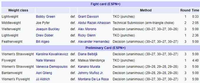 В главном бою встретились Грант Доусон (США, 20–1–1) и Бобби Грин (США, 30–14–1, 1 NC)