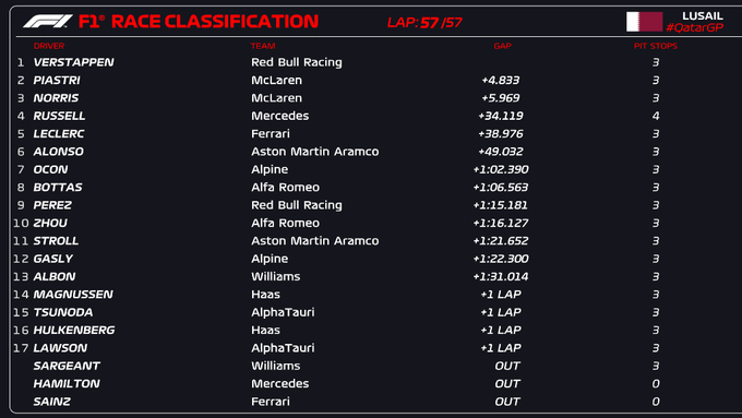 Состоялась гонка в рамках Гран-при Катара. Заезд выиграл пилот Ред Булла Макс Ферстаппен, который стартовал с поула и уже в статусе чемпиона оформил очередную победу.