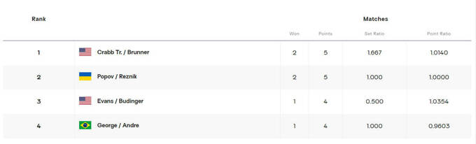 Эдуард Резник (Украина) / Сергей Попов (Украина) – Майлз Эванс (США) / Чейз Бадингер (США) – 0:2 (15:21, 11:21).